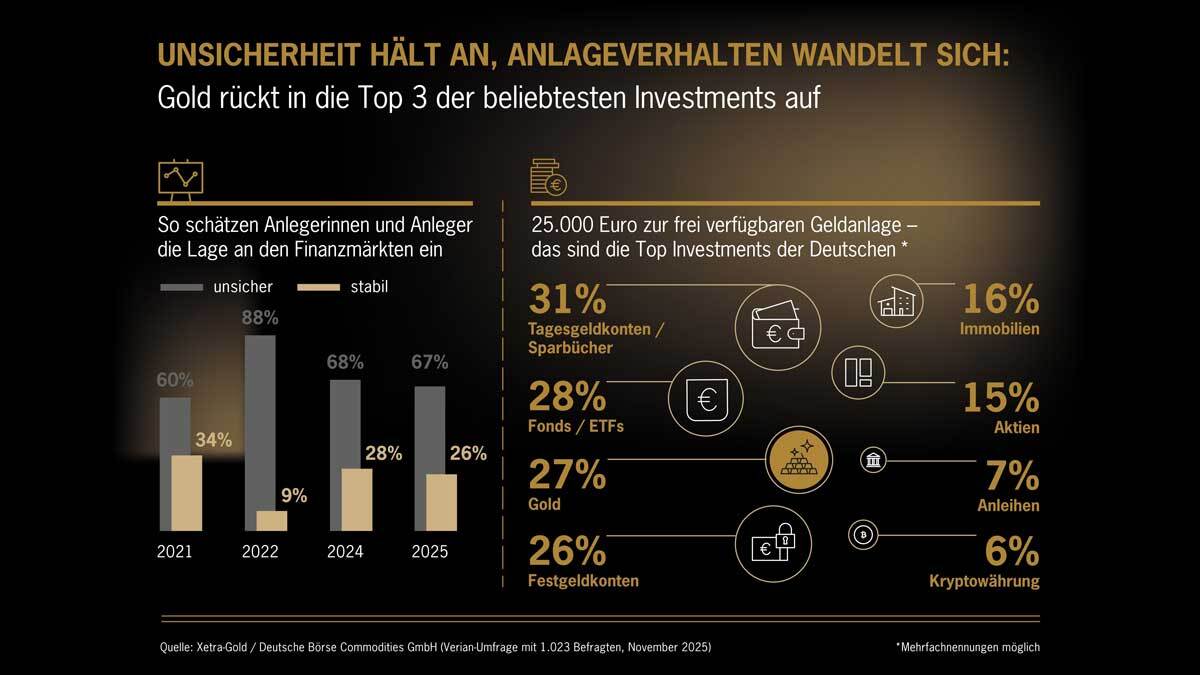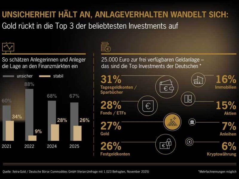 “Das Anlagebarometer zeigt, dass eine konstante Mehrheit der Deutschen die Lage an den Finanzmärkten als unsicher empfindet”, sagt Steffen Orben, Geschäftsführer der Deutsche Börse Commodities GmbH. “Gleichzeitig deutet das repräsentative Stimmungsbild auf ein wachsendes Interesse an Gold hin, dessen Wert 2025 bislang um mehr als 50 Prozent gestiegen ist. Vor allem junge Menschen vertrauen immer stärker auf Gold, da es zu den stabilsten Anlageklassen zählt und sich der Kurs seit Jahren positiv entwickelt. Studien empfehlen einen Goldanteil von fünf bis zehn Prozent im Portfolio, um Vermögen abzusichern.”