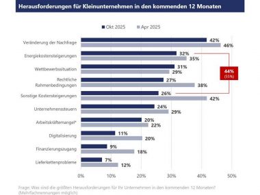 Trotz einer weiterhin angespannten Lage zeichnet sich ein Stimmungsaufschwung bei Kleinunternehmen ab, zeigt die Studie von VR Smart Finanz und der Steinbeis Hochschule aus dem November 2025. Der Kleinunternehmerindex der VR Smart Finanz verdeutlicht, dass die Befragten ihre wirtschaftliche Situation im Vergleich zu vor 12 Monaten etwas besser bewerten als im April 2025. Der Indikator für den 12-Monatsrückblick steigt leicht um 2 Punkte auf +2. Der Blick nach vorn fällt deutlich positiver aus: Der Zukunftsindikator wächst merklich um 11 Punkte auf +30. Dementsprechend nehmen die Sorgen für die kommenden Monate ab und die Investitionsbereitschaft wächst. Die Politik hat daran allerdings keinen Anteil, zeigt die Studie.