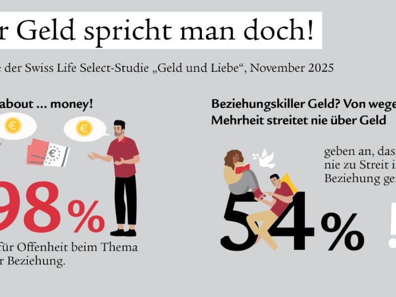 “Die Offenheit, über Geld zu sprechen, nimmt in allen Lebensbereichen zu”, sagt Christian Linnewedel, Geschäftsführer Swiss Life Select. “Das betrifft heute auch die Liebe – und zwar über alle Generationen hinweg. Themen wie Risikoabsicherung, Altersvorsorge und Ausgabenplanung sind elementarer Bestandteil der gemeinsamen Lebensplanung. Dabei sollte jede und jeder selbst für das Alter vorsorgen – am besten gemeinsam mit einem Finanzexperten oder einer Finanzexpertin. Ein offener Austausch darüber legt das Fundament für Stabilität und Sicherheit innerhalb der Beziehung.”