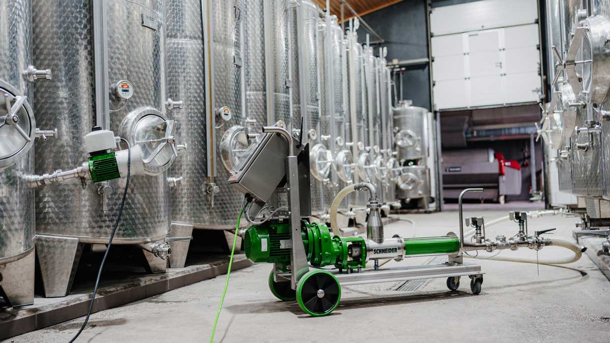 „Unsere grünen SCHNEIDER Pumpen sorgen mit ihrer präzisen Steuerung für eine schonende Förderung. Sie stehen darüber hinaus für zuverlässige und schnelle Produktionsprozesse und ermöglichen somit eine konsistent hohe Weinqualität“, betont Mathias Beck direkt zu Beginn.