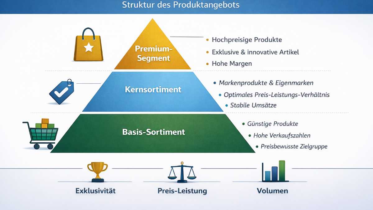 Darüber hinaus trägt die Sortimentspyramide zur Differenzierung im Wettbewerb bei. Während das Basissortiment die Vergleichbarkeit mit Mitbewerbern sicherstellt, ermöglichen Premiumprodukte eine emotionale Markenbindung. Das Kernsortiment fungiert als Bindeglied zwischen Preisorientierung und Qualitätsanspruch.