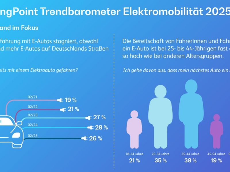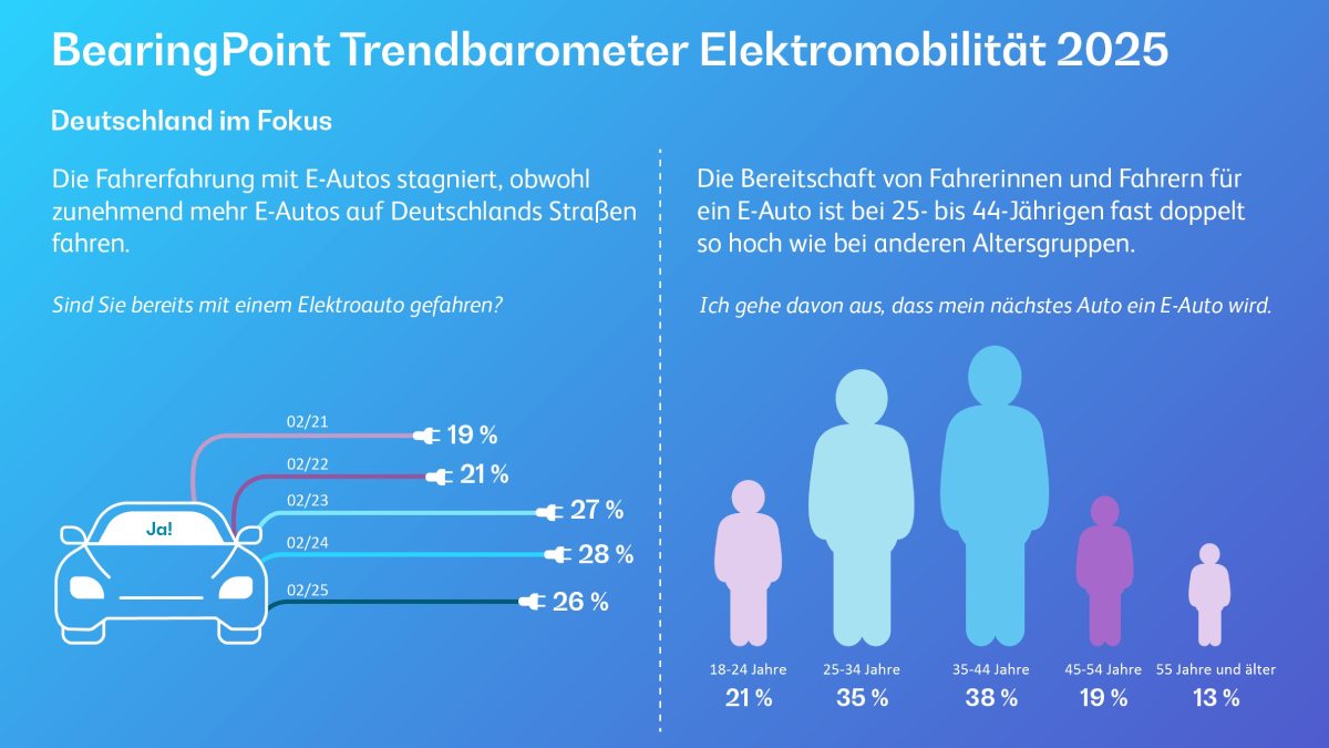 Für das aktuelle Trendbarometer zum Thema Elektromobilität hat das Meinungsforschungsinstitut YouGov im Auftrag der Management- und Technologieberatung BearingPoint vom 15. bis 17. Januar 2025 in allen Teilen Deutschlands insgesamt 2024 volljährige Personen in einem Online-Panel befragt. Die Fragen betrafen das vergangene, gegenwärtige und zukünftige (Kauf-) Verhalten und grundsätzliche Einstellungen und Erfahrungen beim Thema Elektromobilität. Die Erhebung wurde nach Alter, Geschlecht und Region quotiert und die Ergebnisse anschließend entsprechend gewichtet. Die Ergebnisse sind repräsentativ für die Wohnbevölkerung in Deutschland ab 18 Jahren.